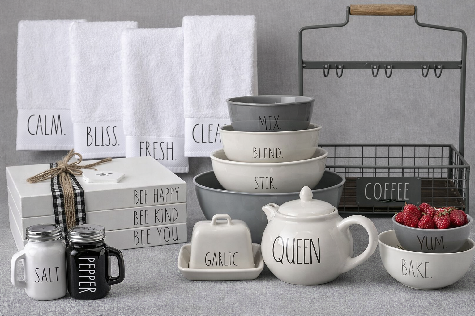 A premium 8–10 piece Rae Dunn mystery bundle full of curated farmhouse treasures. May include larger items like canisters, bakeware, utensils holders, platters, and seasonal favorites.
